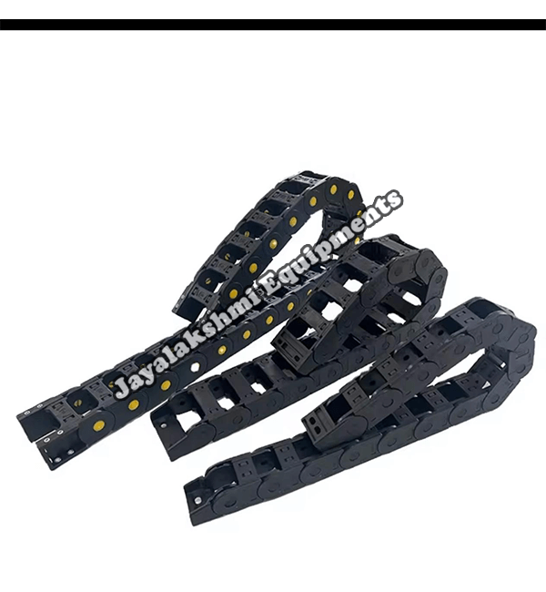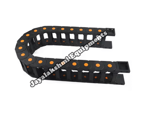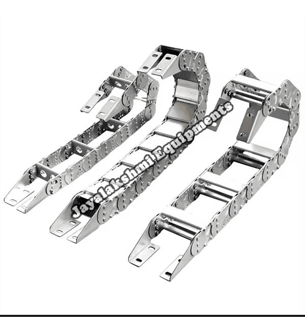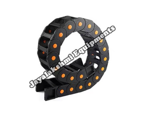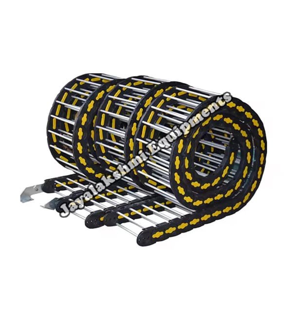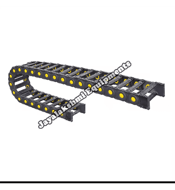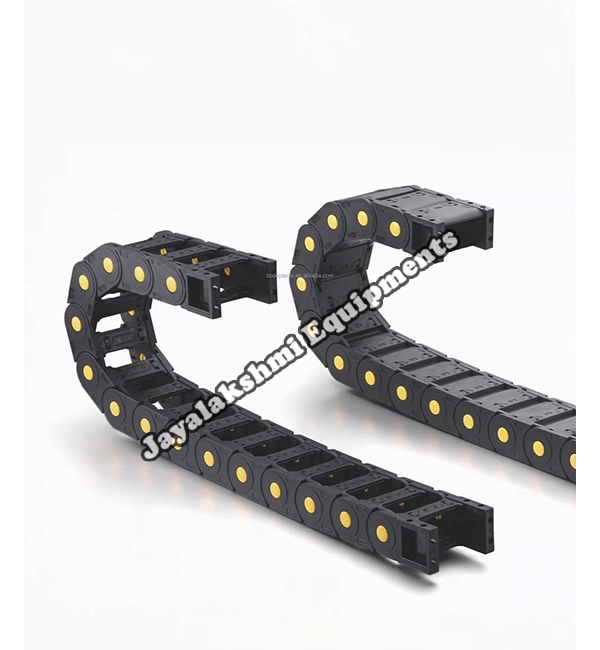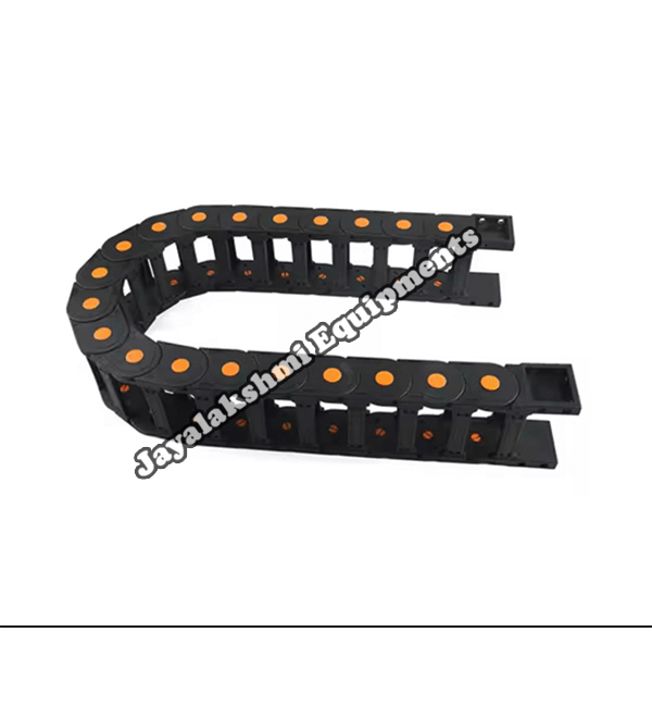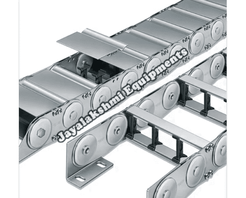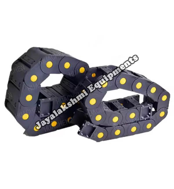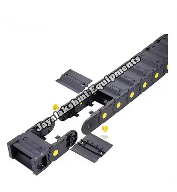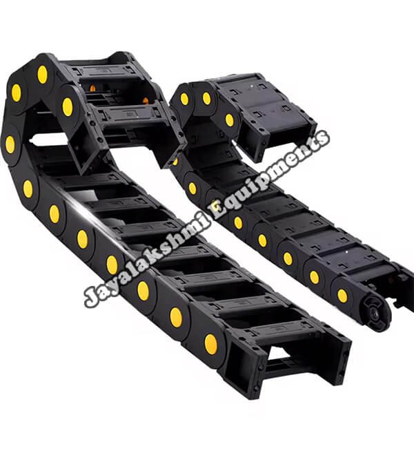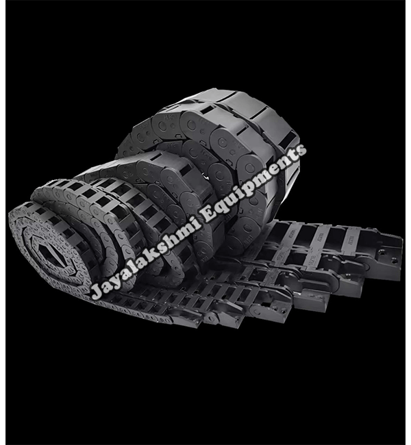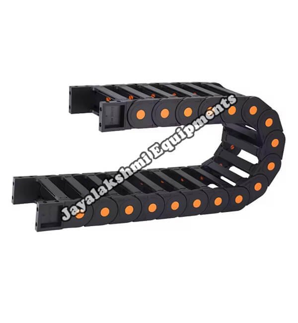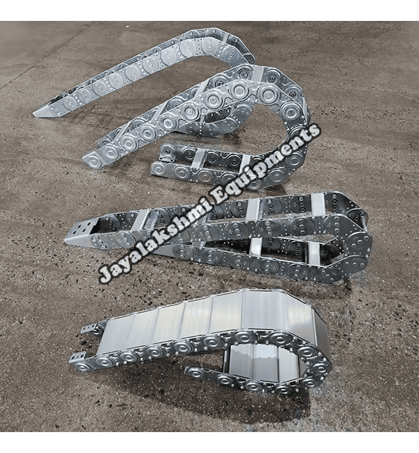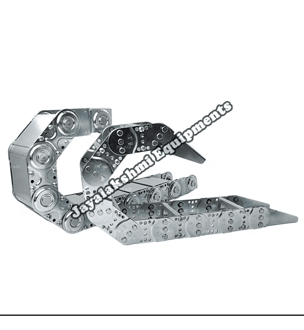 Cable drag chain can be used for conveying cables and hoses, wherein the medium in the hose can be air, liquid or any gaseous matter jayalakshmi equipment cable drag chain can be supplied for wide ranges of length of travel, number of cables and hoses, acceleration and speed requirements, existing space conditions, movements and special work environments.